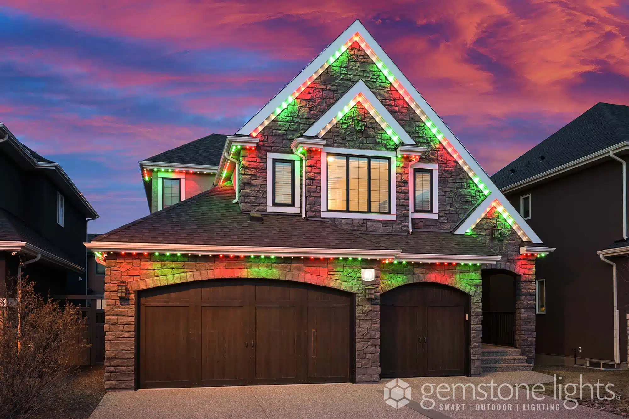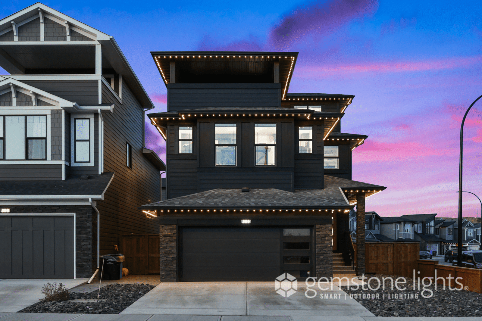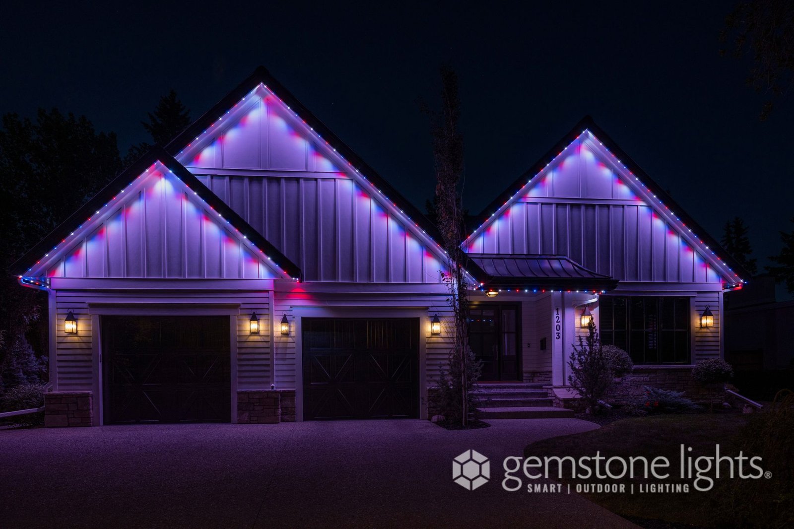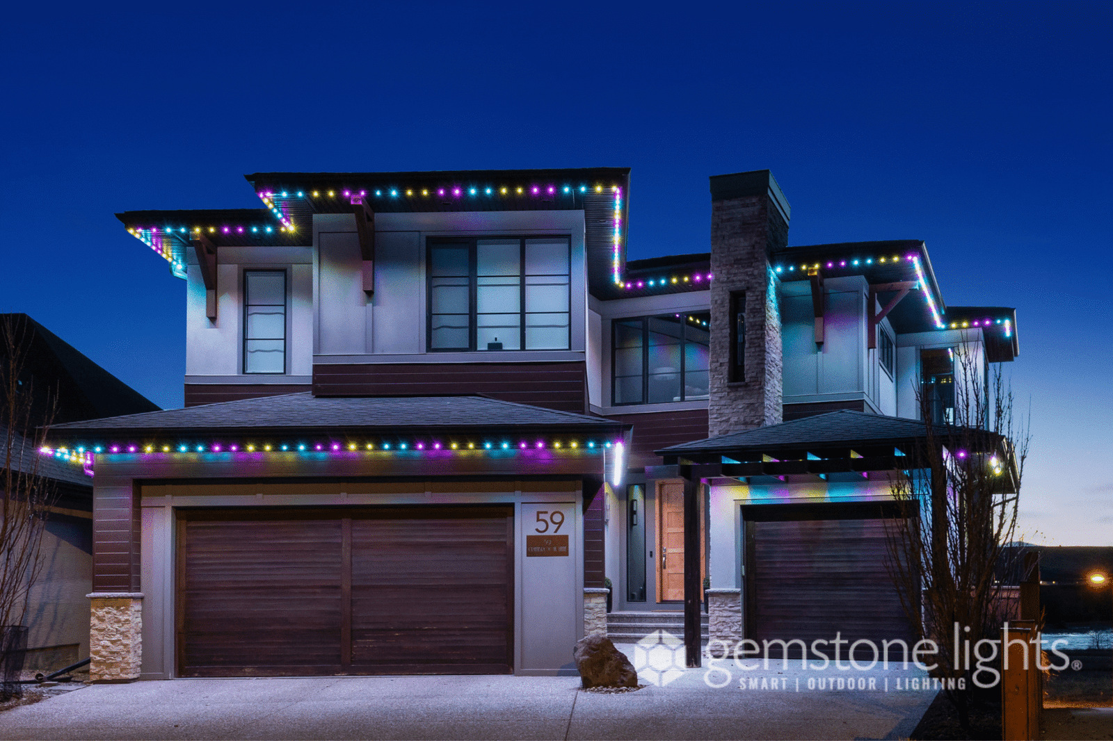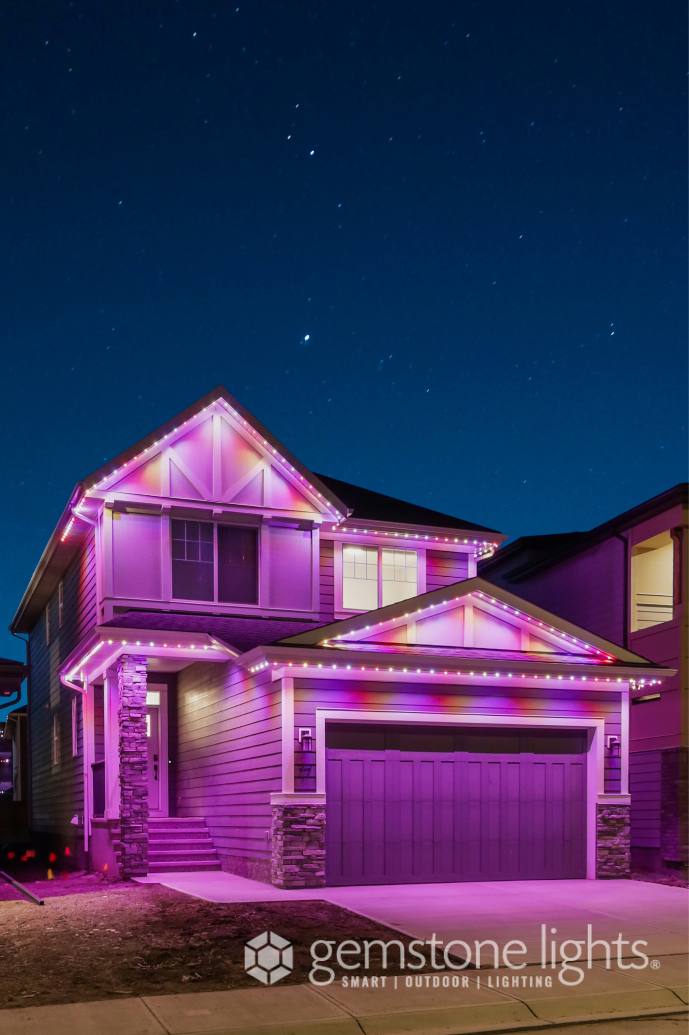 Gemstone Lights are a permanent, app-controlled outdoor lighting system that lets you change colors, brightness, and patterns anytime — for holidays, events, or everyday ambiance. The system uses RGBWW LED lights installed in a color-matched aluminum track that blends seamlessly into your roofline, nearly invisible by day and brilliant at night.